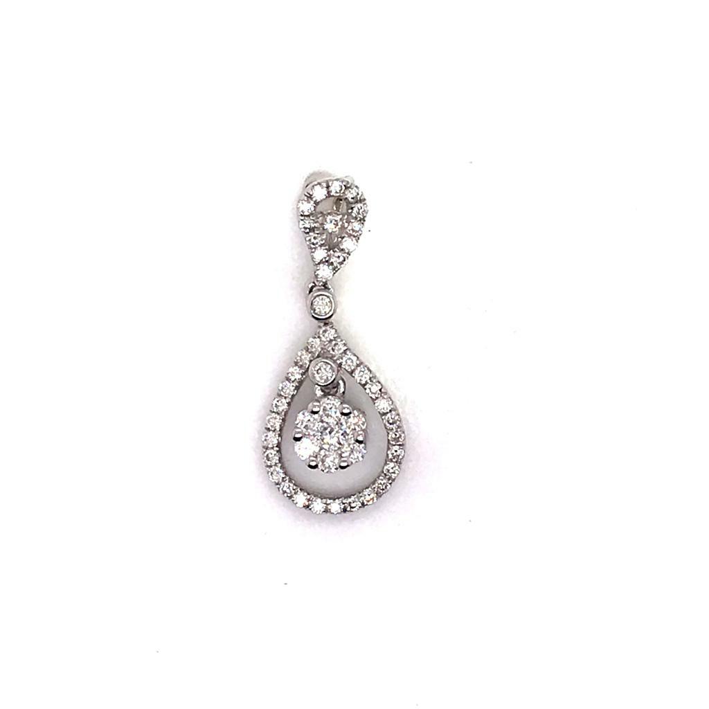 Exotic pear-shape drop pendant for everyday! Featuring round white diamonds in a pear shape setting in prong set.